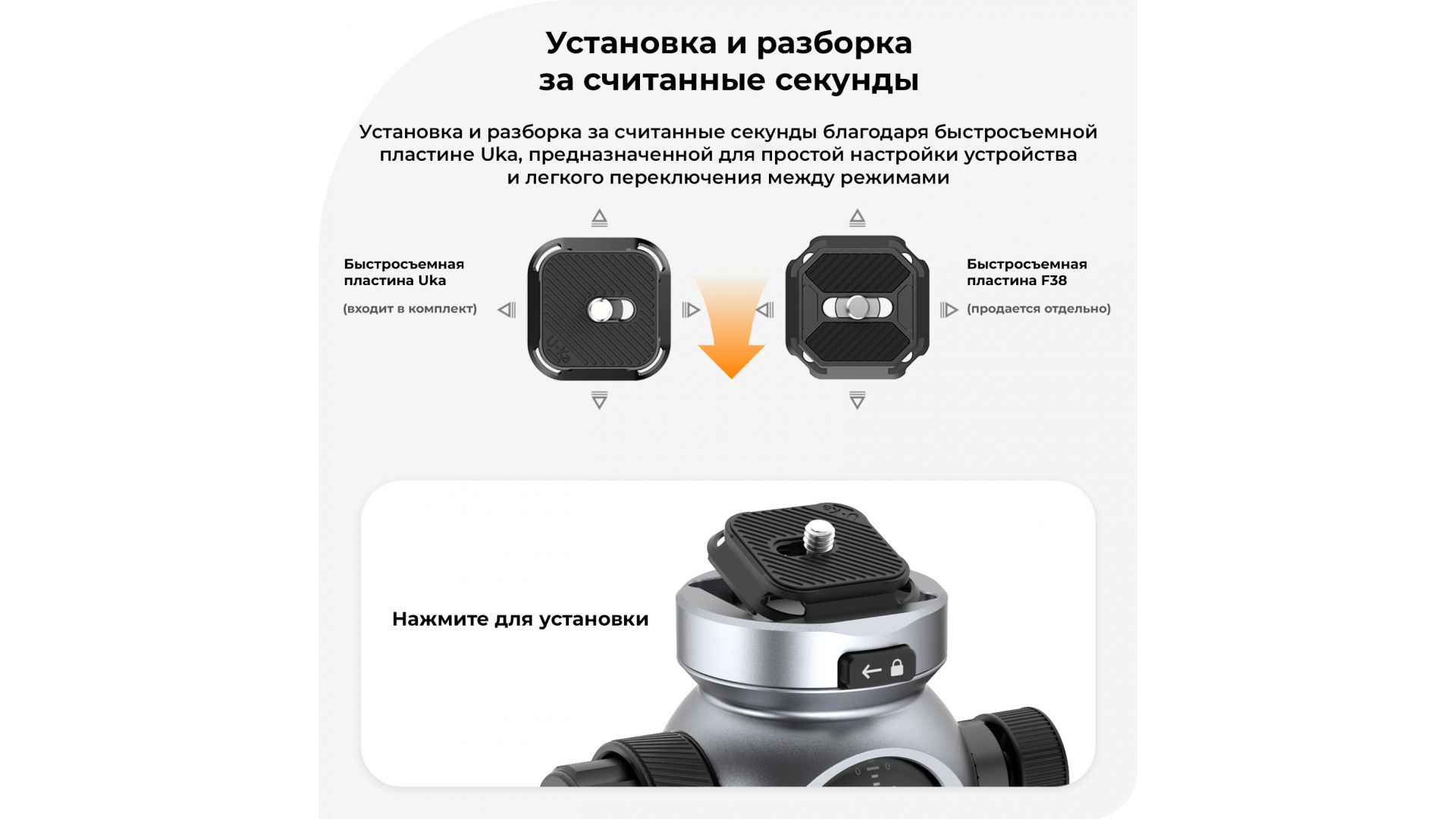 - Установка и разборка за считанные секунды благодаря быстросъемной пластине Uka, предназначенной для простой настройки устройства и легкого переключения между режимами