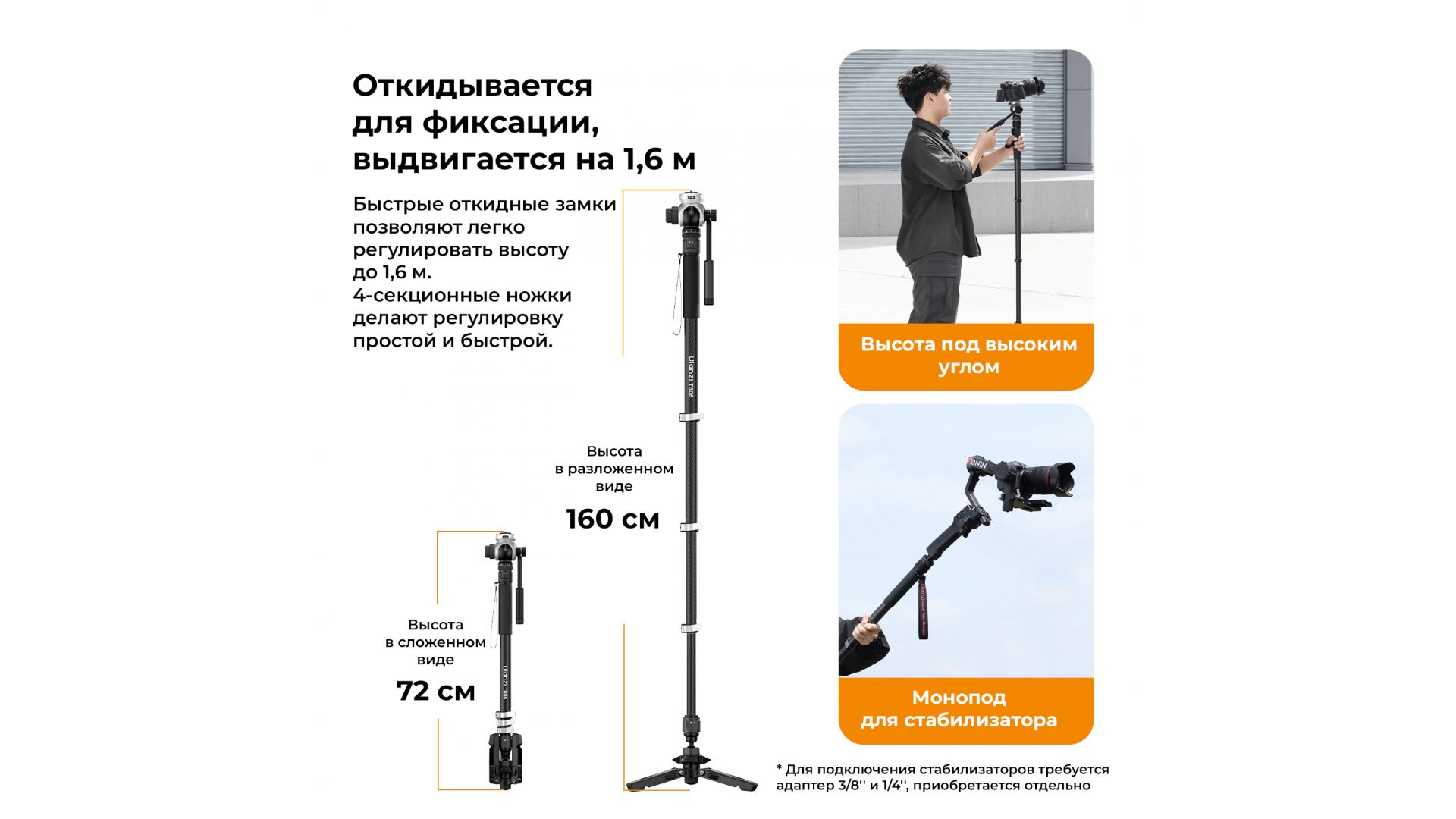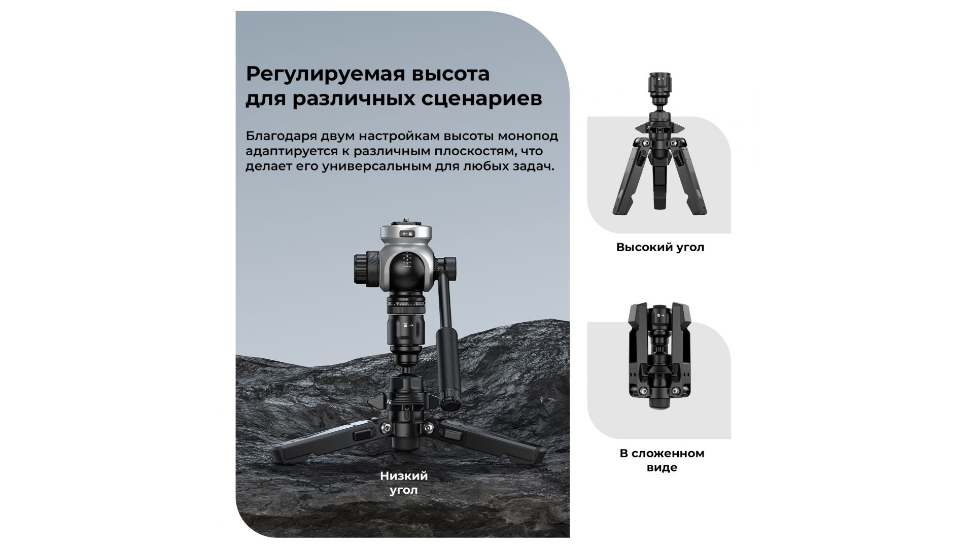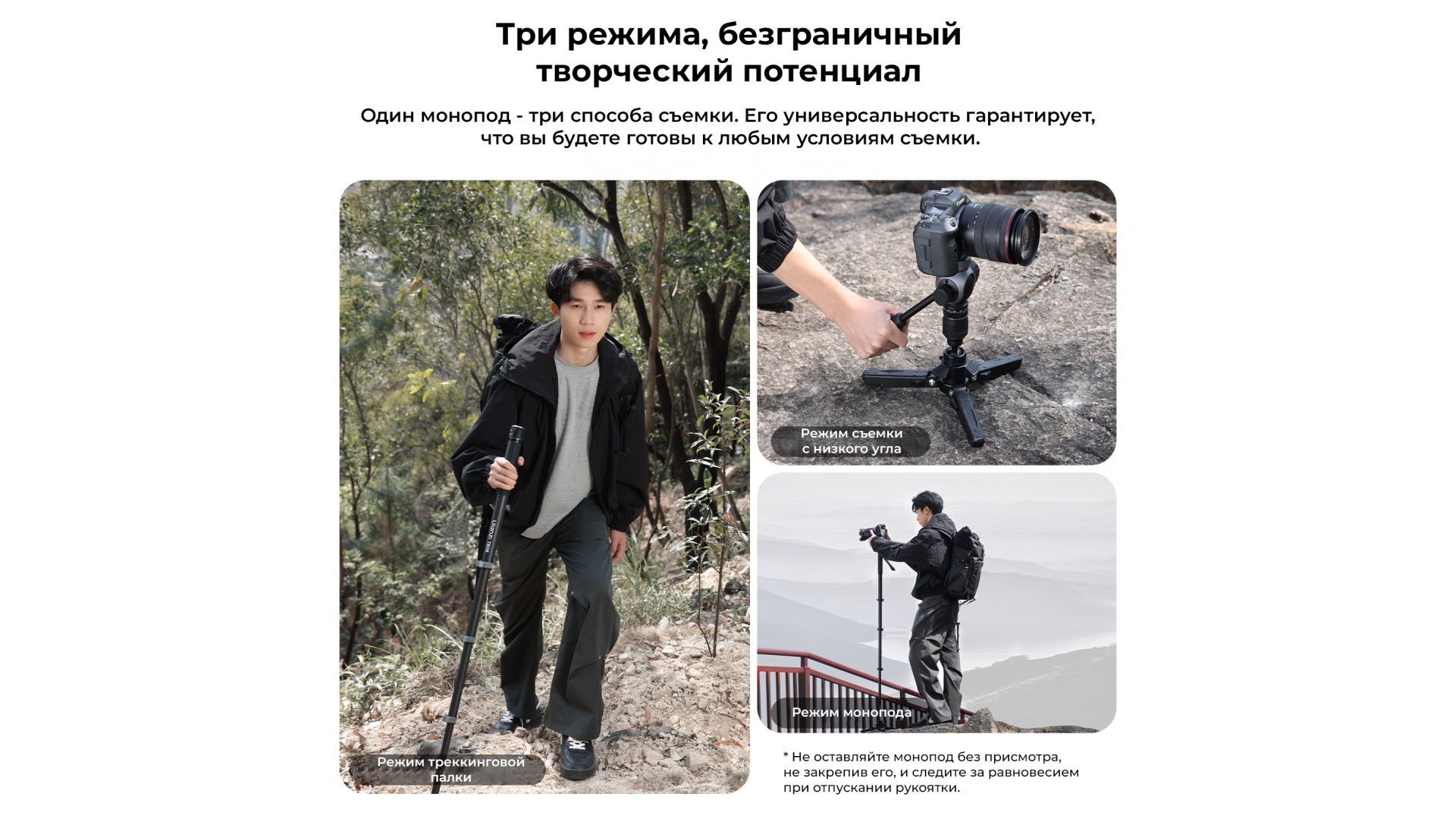 - Один монопод - три способа съемки. Его универсальность гарантирует, что вы будете готовы к любым условиям съемки. Доступен режим треккинговой палки и режим монопода.