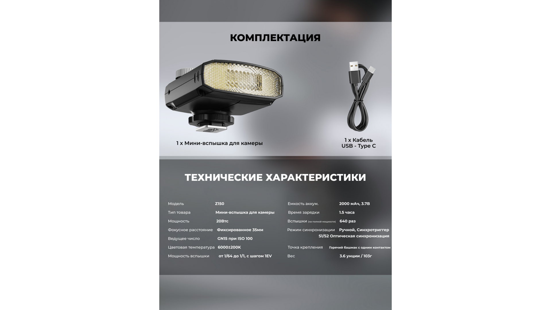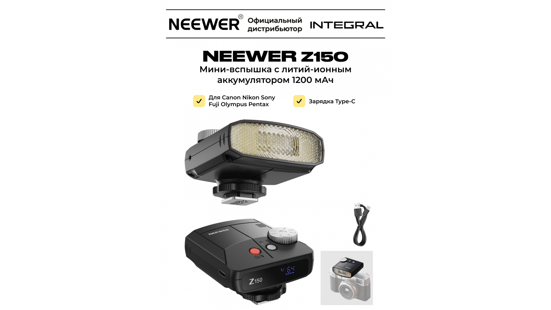 Комплектация:Вспышка NEEWER Z150, кабель для зарядки USB - Type-C.