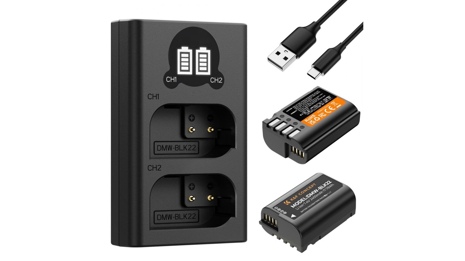 Комплект аккумуляторов и зарядное устройство K&F Concept KF28.0042 — это надежное решение для длительной съемки. В набор входят два литий-ионных аккумулятора DMW-BLK22 емкостью 2400 мАч (17,76 Втч) каждый, которые идеально подходят для камер Panasonic Lumix S5, S5II/X, GH5 II, GH6 и других моделей, использующих данный тип батарей.
