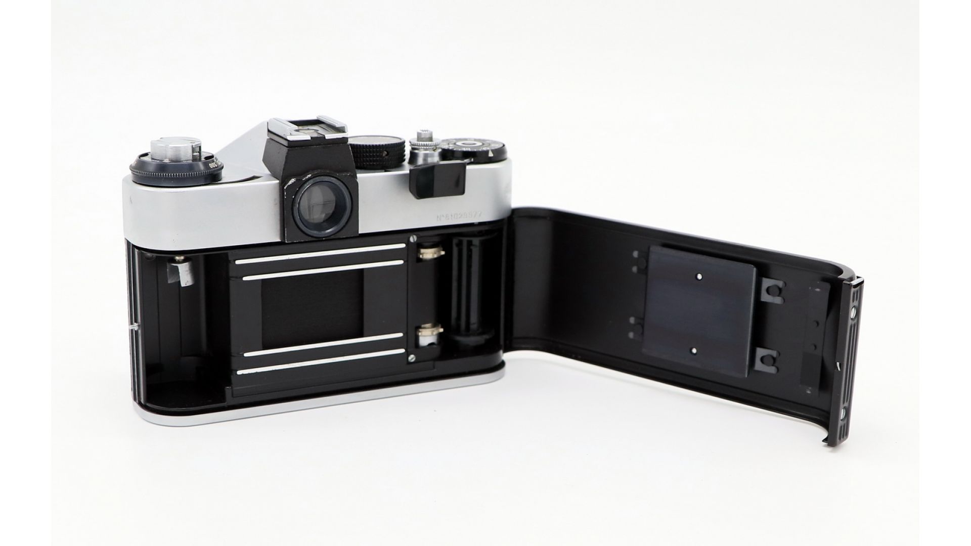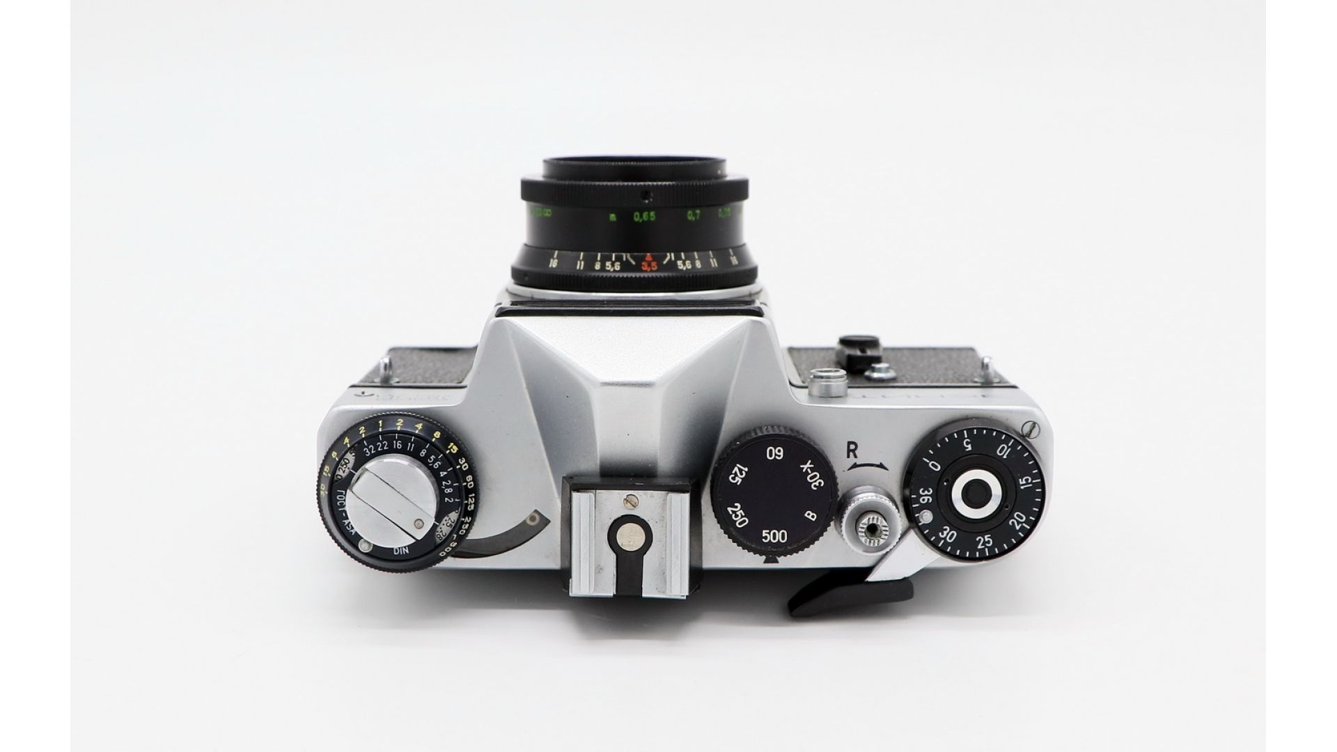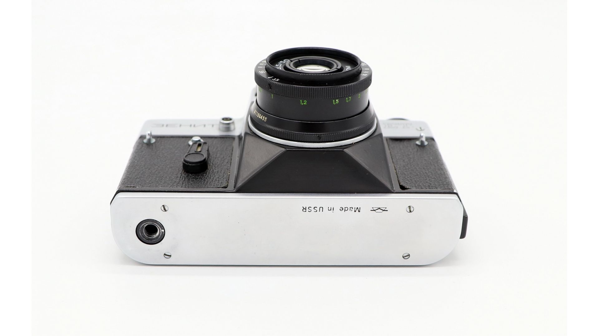 Классический советский зеркальный фотоаппарат в серебристом исполнении в полном комплекте со штатным объективом. Проверенная временем связка для съёмки на 35-мм плёнку.