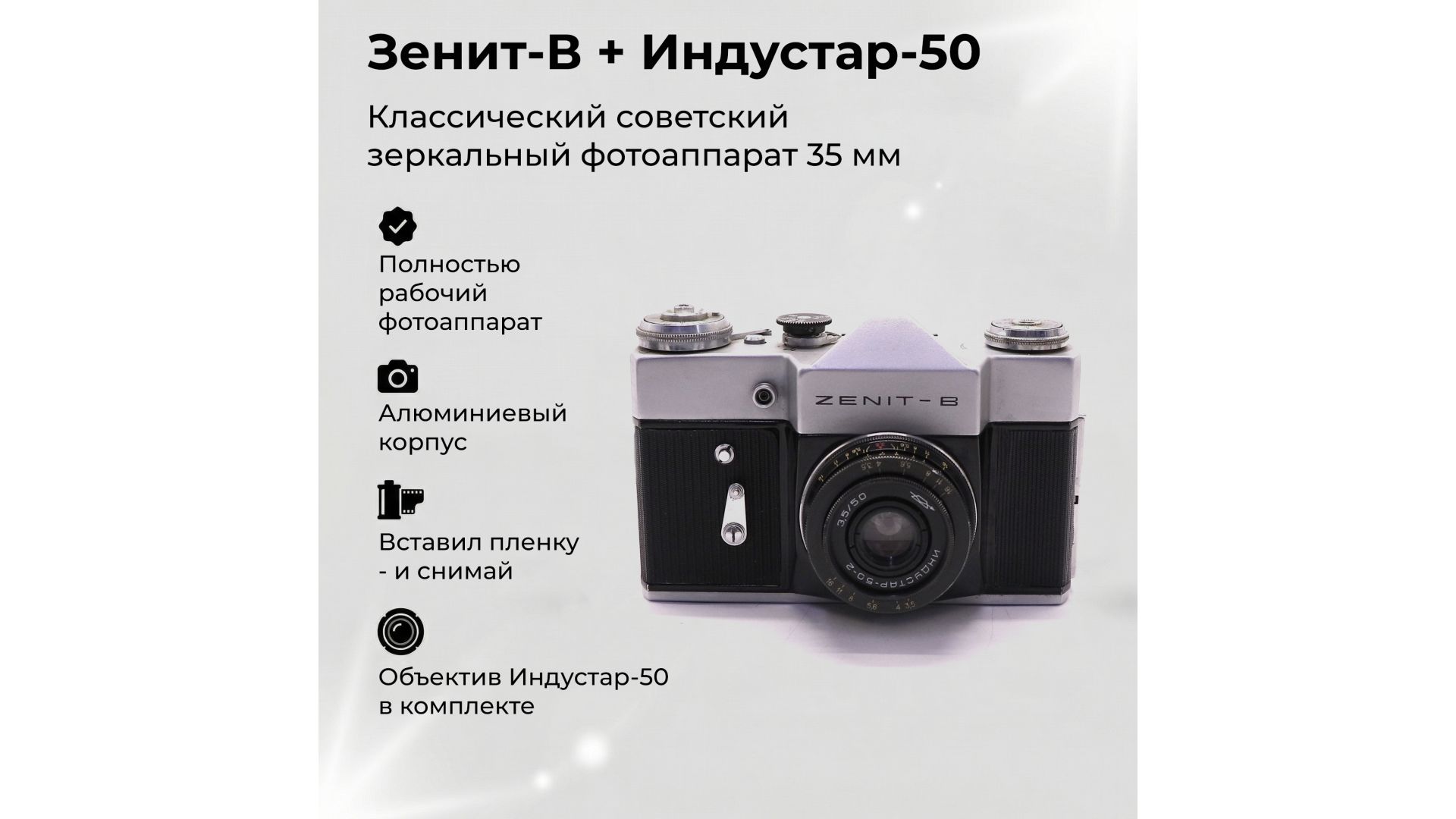 Зеркальный фотоаппарат Zenit-B — классическая советская плёночная камера для любителей и коллекционеров. Обеспечивает надёжную механическую работу, простоту управления и классический формат 35 мм для творческой съёмки.