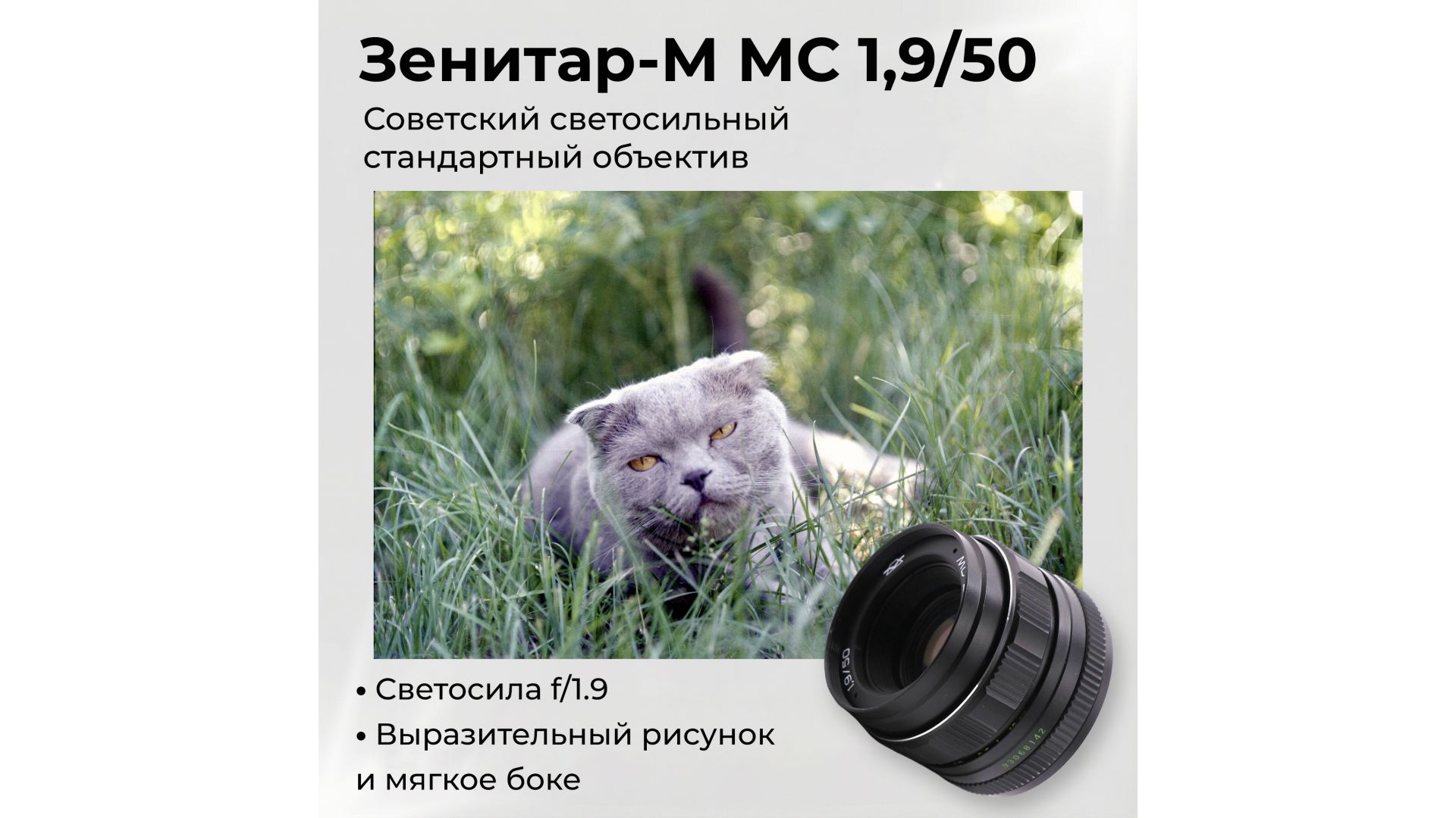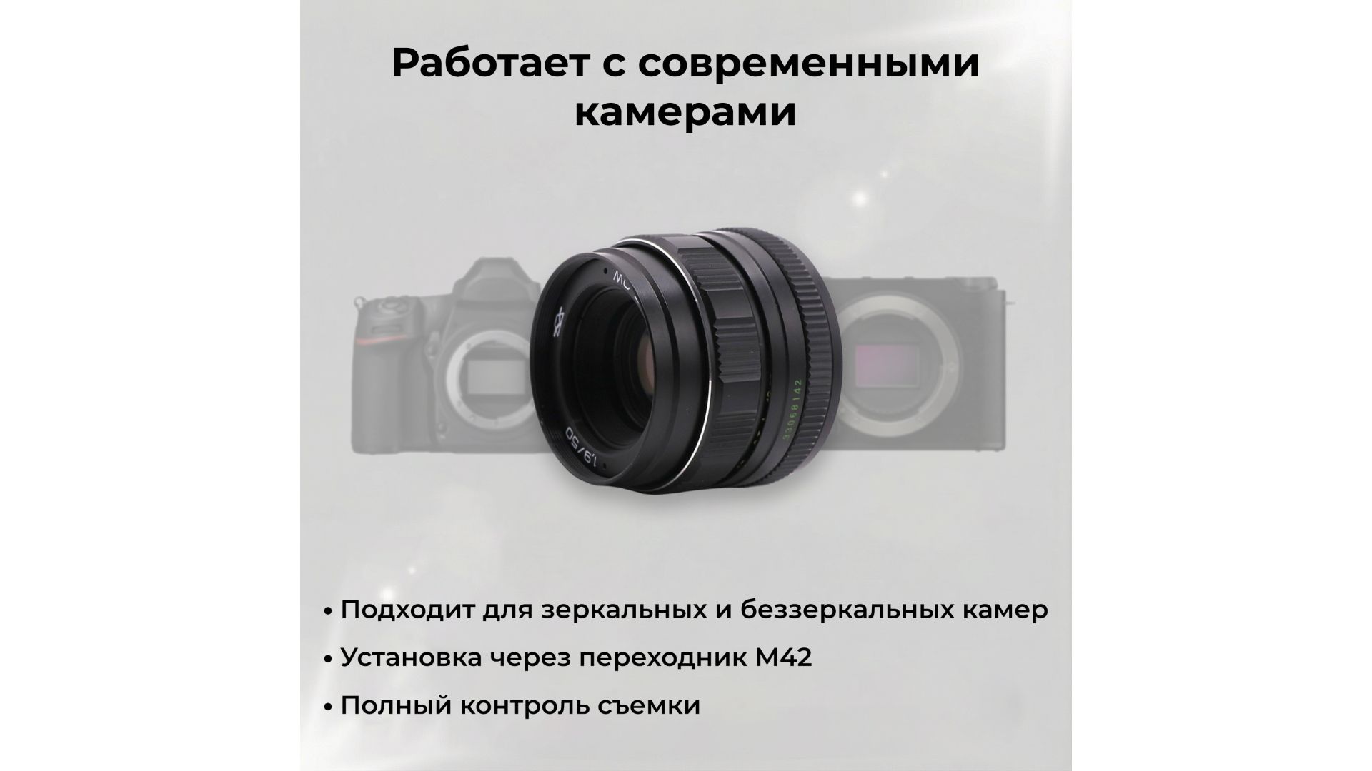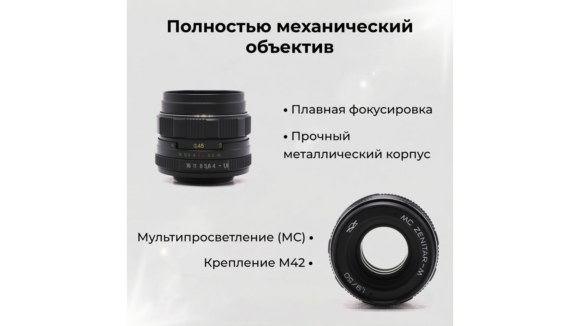 Объектив Зенитар-М МС 1,9/50 — светосильный стандартный объектив с резьбовым креплением М42, созданный для универсальной фото- и художественной съёмки. Отличается плавным ходом фокусировочного кольца и качественной оптикой, обеспечивающей выразительный рисунок.