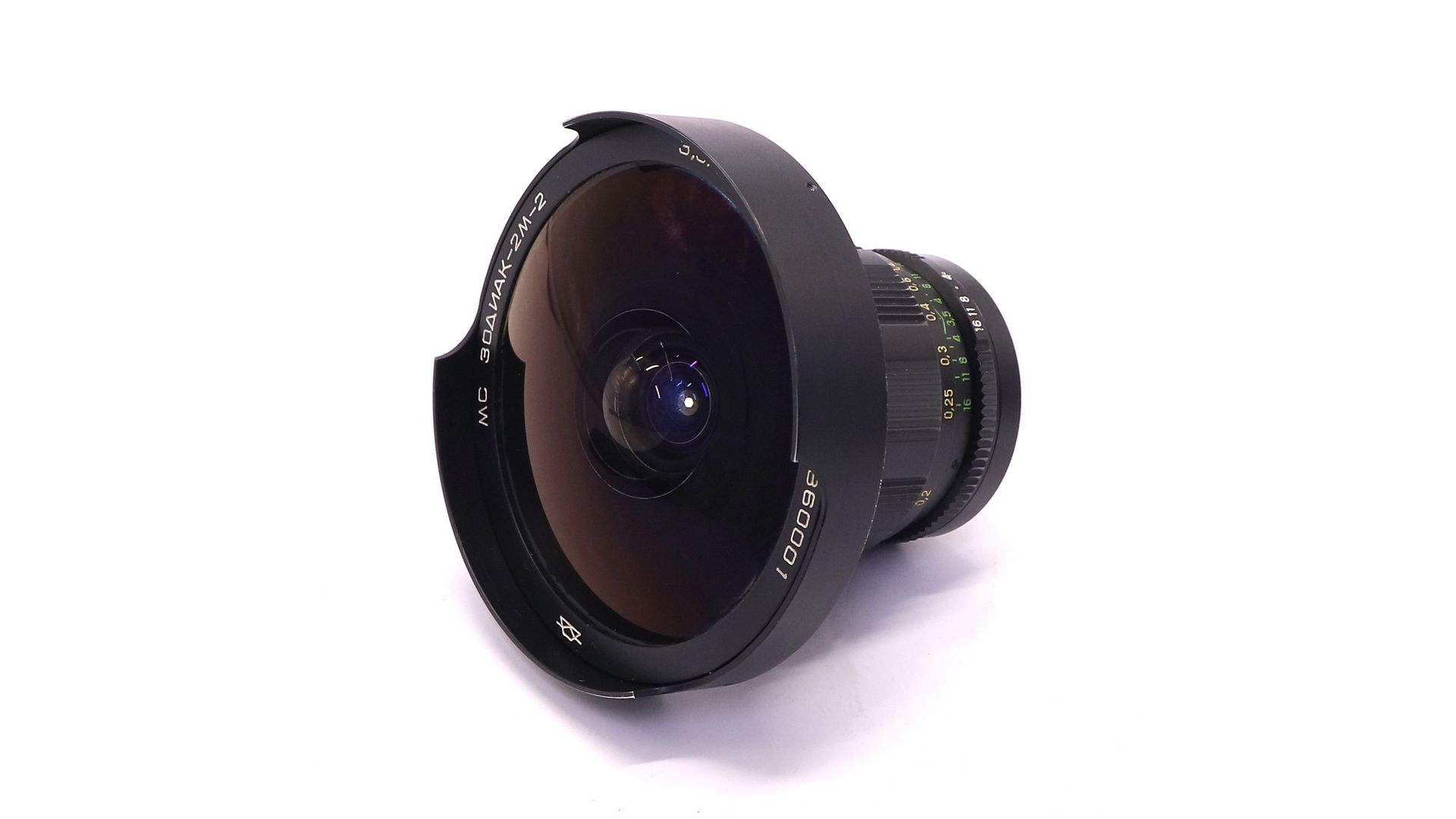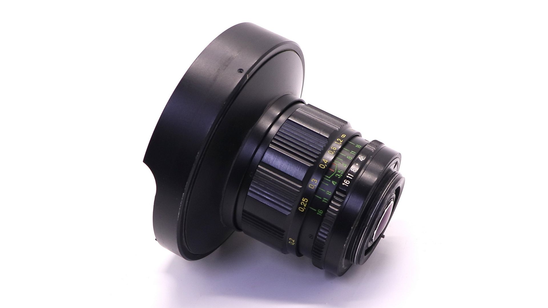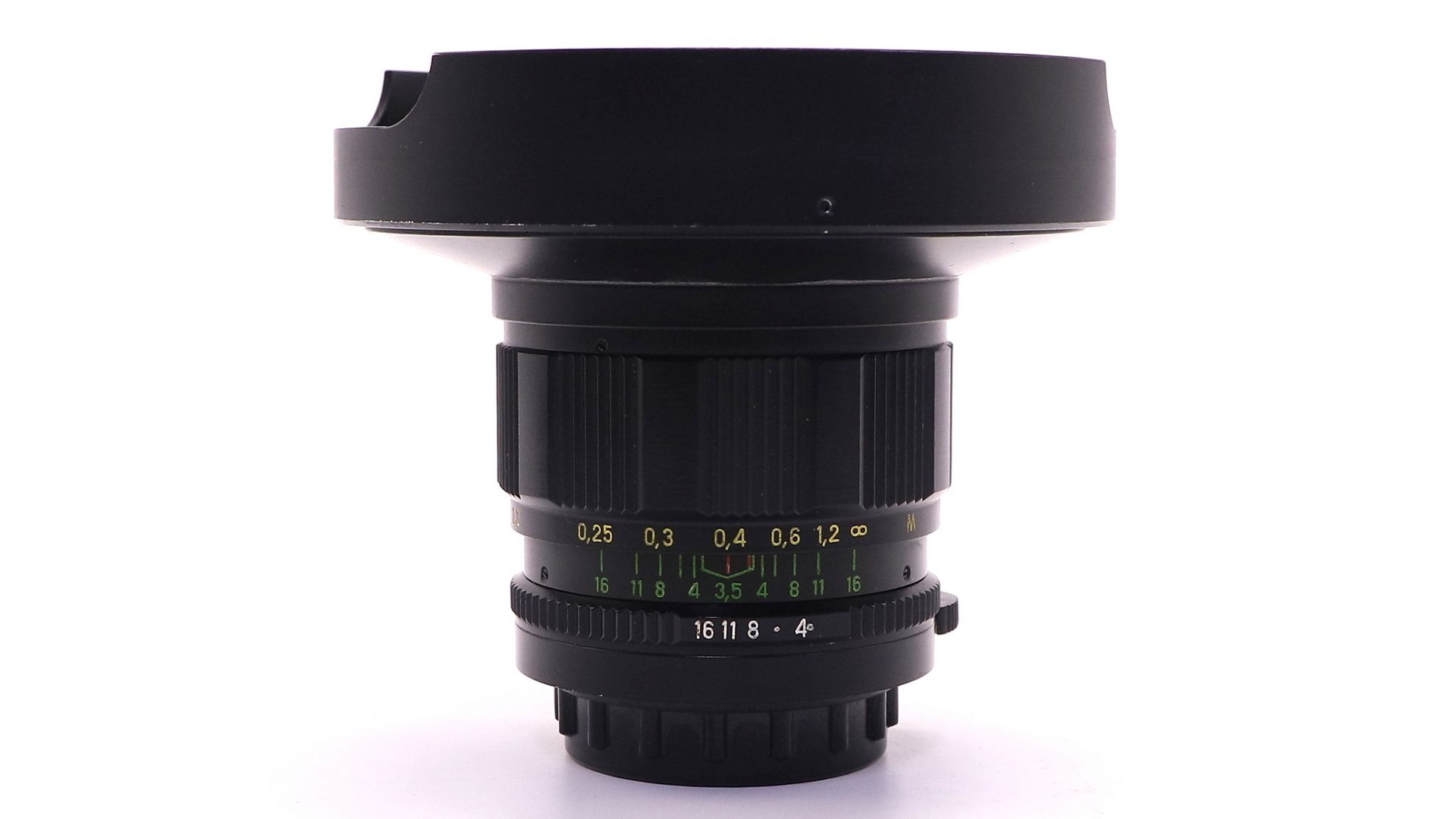 Крайне редкий объектив для малоформатных зеркальных фотоаппаратов с резьбовым присоединением сменной оптики. Снабжен ирисовой автоматизированной отключаемой диафрагмой. Многослойное просветление. Угол поля зрения - 180°, количество линз/групп - 9/5, пределы шкалы диафрагм: 1:3,5 - 1:16, ближний предел фокусировки: 0,2 м. Разрешающая способность по ТУ (центр/край) - 48/18 линий/мм. Присоединительная резьба - М42х1, резьба для ввинчивающихся насадок - M28x0,75, расположение светофильтра заднее. Габаритные размеры: длина объектива - 103 мм, наибольший диаметр оправы - 90 мм. Формат кадра - 24x36